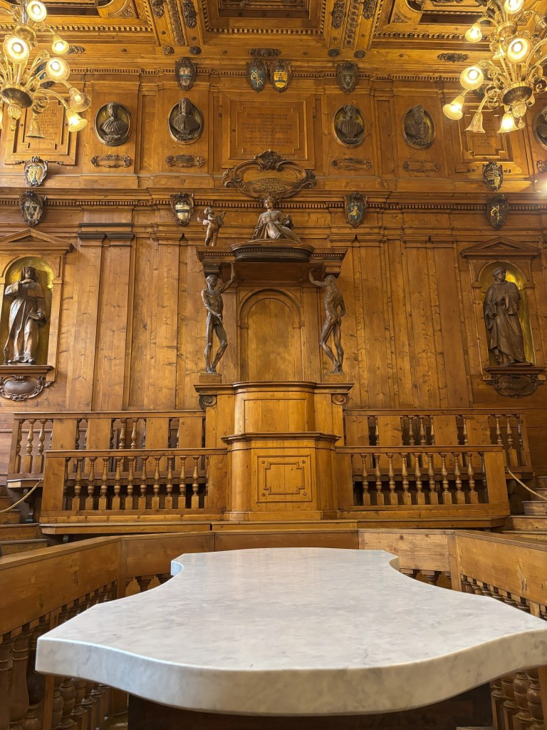 Teatro Anatomico için alınan bilet ile birlikte bu alan da gezilebiliyor. Aynı biletle gezilebilen bu iki alan arasındaki geçişte üniversiteye katkı sağlayan kişi ve ailelerin armalarını görebilirsiniz. Ayrıca bu kütüphanede çok önemli ve ilk baskı kitaplar da muhafaza ediliyor.