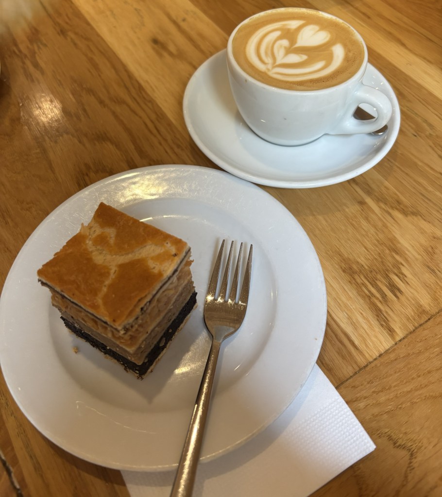 Budapeşte’de tatlılar denemekle bitmiyor! Espresso Embassy’de pek çok gezi yazısında gördüğümüz Flodni tatlısını denedik. Genellikle diğer yerel tatlılar gibi kat kat yapıya sahip olan bu tatlının katmanlarında elma, ceviz ve erik marmelatı bulunuyor.